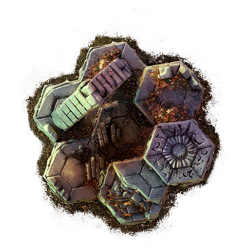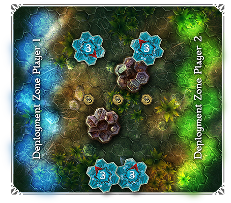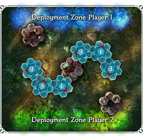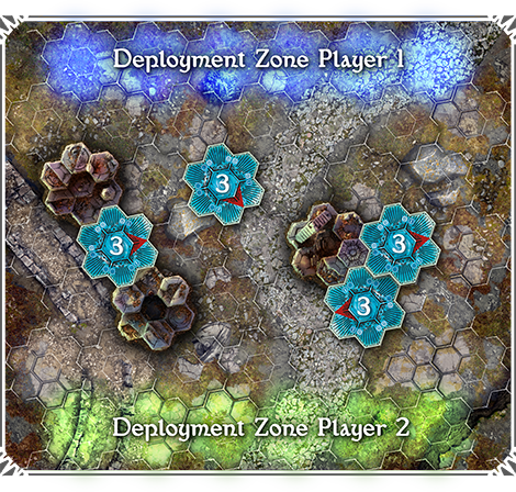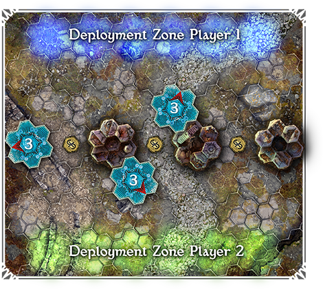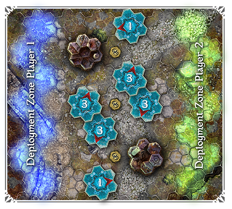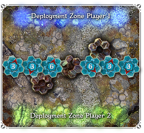 Place the three Common Scenario Markers on battlefield according to the scheme. The markers are not Portable or Linked. Miniatures can occupy Hexes occupied by these Markers. Ethereal Vortices cannot move to Hexons occupied by these Markers. At the start of game markers on the battlefield have a neutral status.