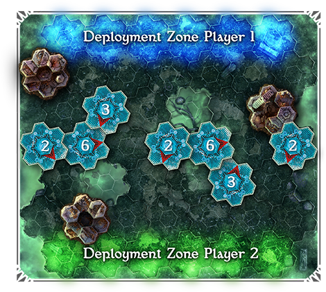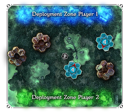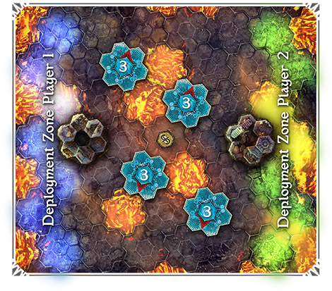 Place the four Common Scenario Markers on battlefield according to the scheme. The markers are not Portable or Linked. Miniatures can occupy the Hexes occupied by the Marker and move through them. Hexons marked with a Marker are considered Ether Nodes. At the end of the Scenario, if the player's Miniature occupies a Hexon marked with a Marker, then the player is considered to have captured this Ethereal Node. If the Miniatures of both players occupy this Hexon, then the player whose value of the Miniatures occupying the Hexon is greater is considered to have captured it. Vortices cannot move to the Etheric Nodes.